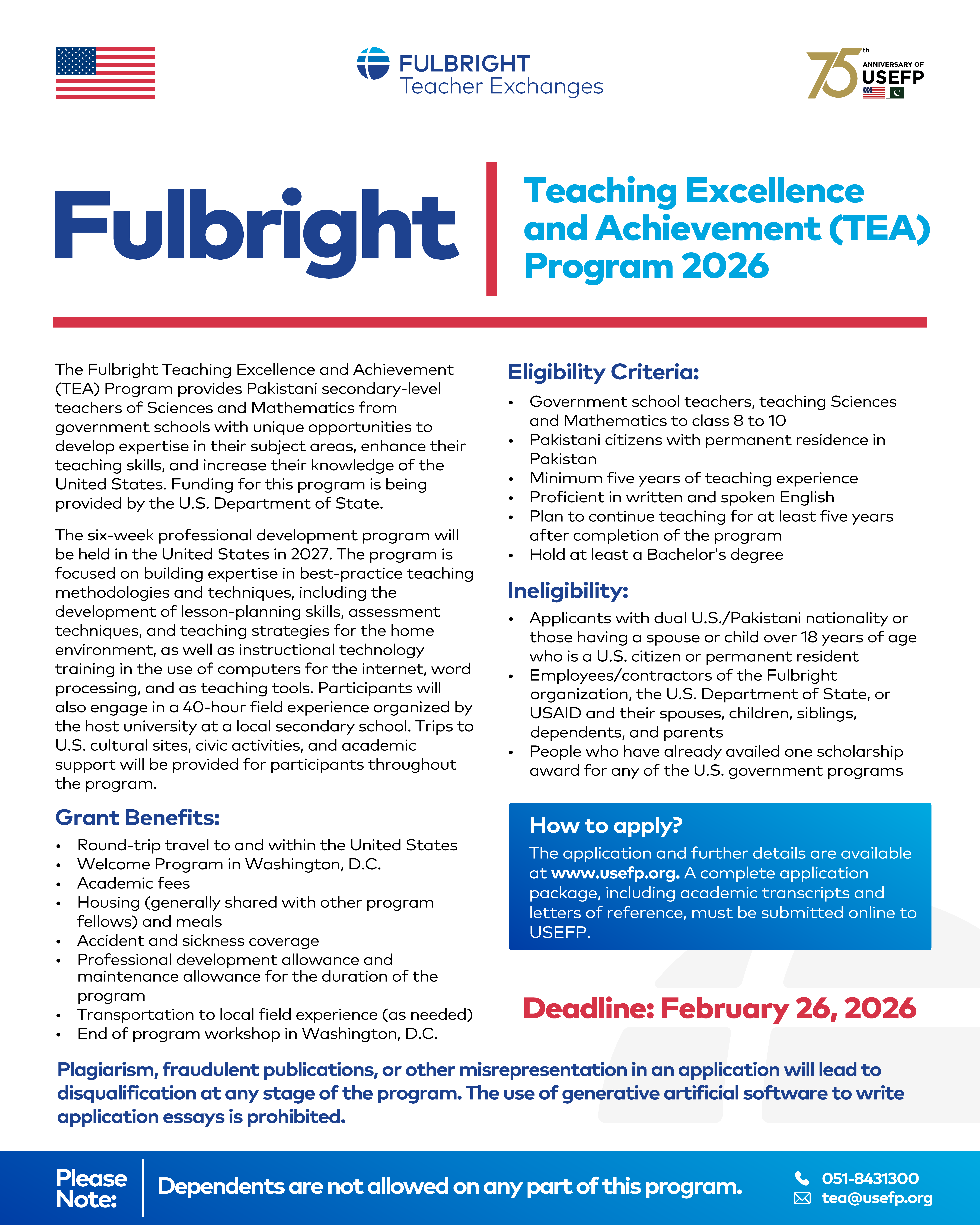 The Fulbright Teaching Excellence and Achievement (TEA) Program for Pakistan will provide Pakistani teachers from government schools with unique opportunities to develop expertise in their subject areas, enhance their teaching skills, and increase their knowledge of the United States. This program is designed to enhance teachers' expertise in their teaching discipline and equip them with a deeper understanding of best practices in teaching methodologies, lesson planning, and the use of technology in teaching to create among educators a more nuanced understanding of the U.S. and to develop productive and lasting relationships and mutual understanding between U.S. and Pakistani teachers and their students. This is also intended to contribute to improving teaching in participating countries by preparing participants to serve as teacher leaders, who upon returning home will apply and share their experience and skills with their peers and students. All participants must return immediately to their home country upon completion of the program. A group of teachers will go to the U.S. for eight weeks of internship in academic settings.